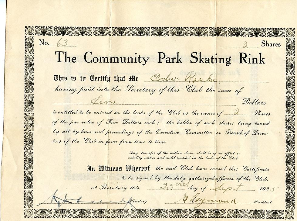 | Description: | This certificate is evidence of Edward Rorke's two shares in Thornbury's local community park skating rink. |