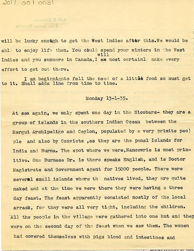 | Description: | Letter from Willard to his mother from when he was stationed on the H.M.S Emerald, East Indies Station. Willard wrote an eight page typed letter to his mother describing his time away from home. The letter was written January 5, 1935. Back of page 5 |