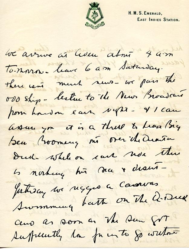 | Description: | Letter from Willard to his mother. The letters were sent when Willard was stationed on the H.M.S Emerald in the East Indies. Willard wrote an eight page handwritten letter to his mother describing his time away from home. The letter was written October 15, 1934. Page 7 |
