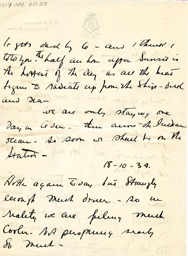 | Description: | Letter from Willard to his mother. The letters were sent when Willard was stationed on the H.M.S Emerald in the East Indies. Willard wrote an eight page handwritten letter to his mother describing his time away from home. The letter was written October 15, 1934. Back of page 6 |