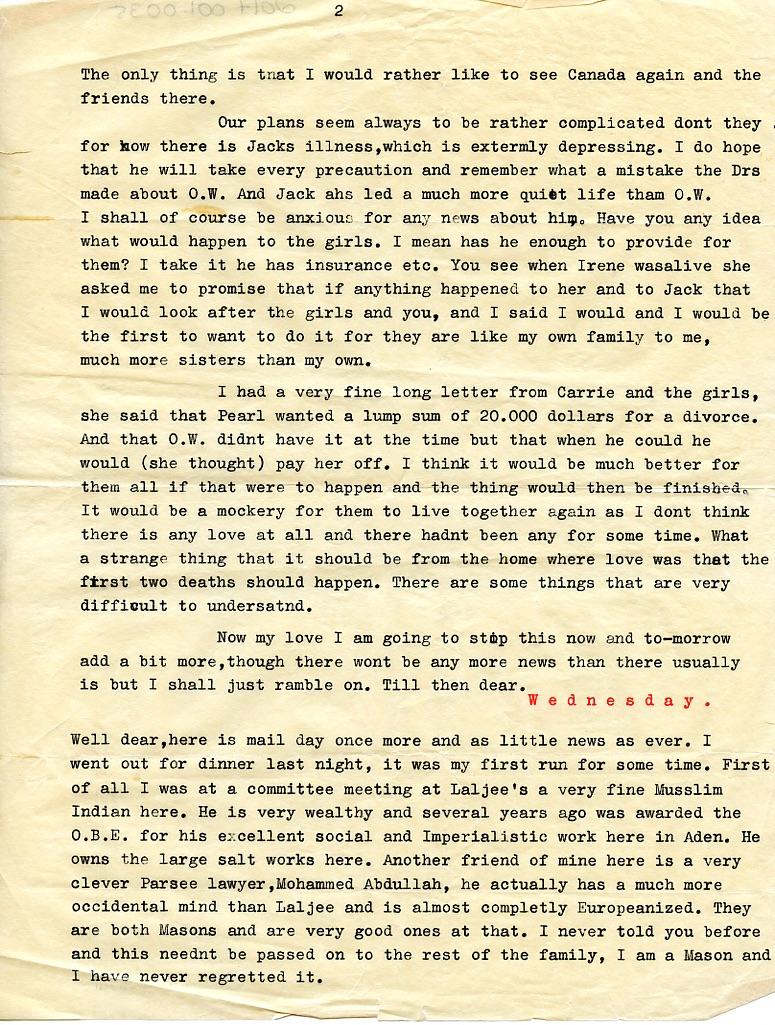 | Description: | Letter from Willard to his mother from when he was stationed on the Union club Aden Arabia. Willard wrote a two page handwritten letter to his mother describing his time away from home. The letter was written January 3, 1936. This is the back of page 1 |