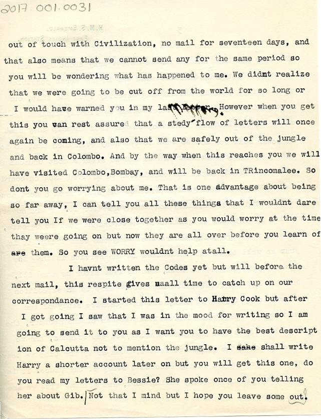 | Description: | Letter from Willard to his mother from when he was stationed on the H.M.S Emerald, East Indies Station. Willard wrote an eight page typed letter to his mother describing his time away from home. The letter was written January 5, 1935. Back of page 3 |