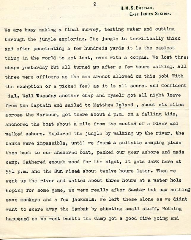 | Description: | Letter from Willard to his mother from when he was stationed on the H.M.S Emerald, East Indies Station. Willard wrote an eight page typed letter to his mother describing his time away from home. The letter was written January 5, 1935. Page 2 |